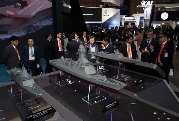 ▲ 7일 부산 해운대구 벡스코에서 열린 ‘2023 부산국제조선해양대제전’에서 참가자들이 한화오션 부스에서 한국형 차기 구축함 모형을 둘러보고 있다. 2023.6.7. (ⓒ뉴스1)