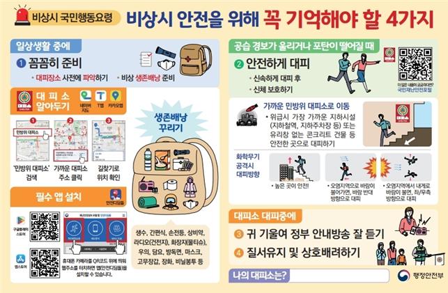 행안부는 매년 `비상시 대국민 행동요령`을 안보상황에 맞게 수정․보완하여 안내책자, 동영상 등 홍보물을 제작․배포(송출)하고 있다.