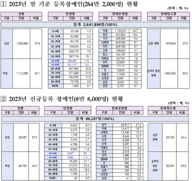 2023년 말 기준 등록장애인은 2,641,896명이다. 2023년 한 해 동안 새롭게 등록된 장애인이 86,287명이었고, 사망 등으로 등록장애인에서 제외된 장애인이 92,815명으로 2022년 말 등록장애인보다 6,528명이 감소하였다. 전체 인구의 감소로 등록장애인의 비율은 5.1%를 유지하였다.