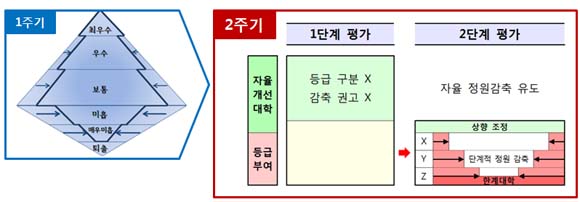 2주기 평가는 1·2단계로 나눠 이뤄진다. 1단계 평가에서는 대학의 자체적인 발전 전략과 고등교육기관으로 갖춰야 할 기본 요소를 따져 자율적인 구조개선 역량이 있는 ‘자율개선 대학’을 뽑는다.