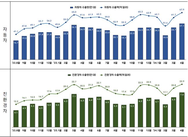 친환경차 4월 수출도 주력 수출시장인 미국, 유럽 등에서 하이브리드차 수요가 증가하면서 22.9억 달러(전년동월 대비 +11.6%)로 역대 최고실적(기존 최고 `23.3월 22.7억 달러)을 기록했다.