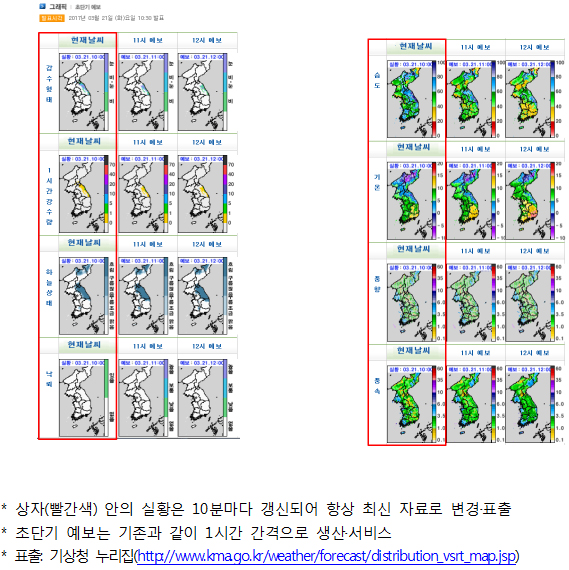 초단기 예보의 실황은 기상청 누리집의 동네예보에서 확인할 수 있다.