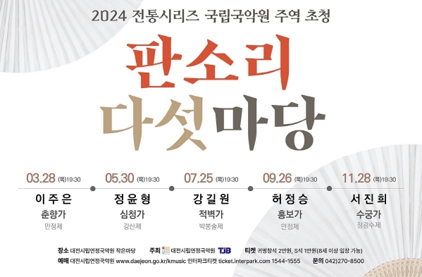 [일간환경연합 김경훈 기자] 대전시립연정국악원(이하 국악원)이 TJB대전방송(이하 TJB)과 공동주최로 2023 전통시리즈‘국립국악원 주역 초청, 판소리 다섯 마당’두 번째 무대로 대한민국 차세대 주역이자 재기 발랄한 젊은 소리꾼 정윤형의 `심청가` 공연을 5월 30일 19시 30분 국악원 작은마당에서 진행한다.