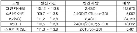 리콜대상은 지난 2013년 8월 이전에 생산된 세타2 엔진 장착 차량으로 그랜저 11만 2670대, 쏘나타 6920대, K7 3만 4153대, K5 1만 3320대, 스포티지 5401대다.