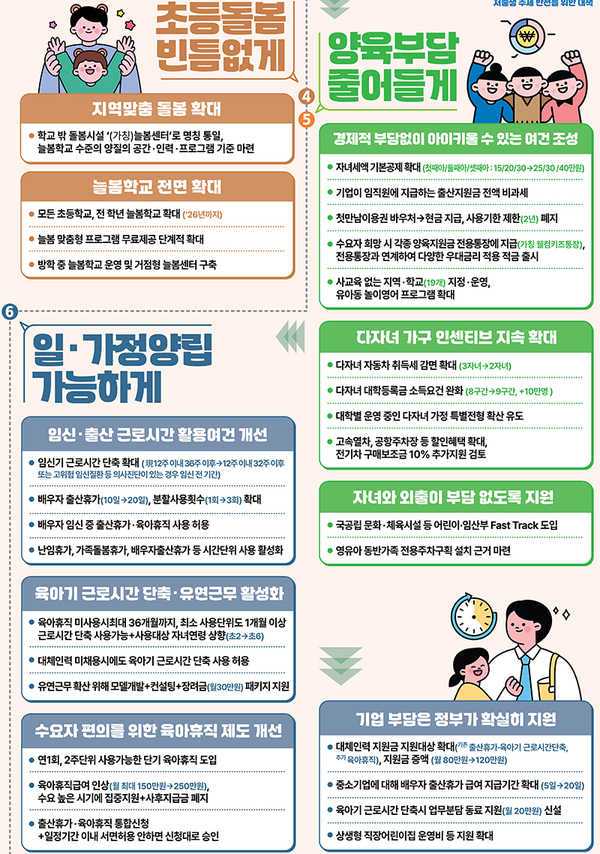 정부는 이번 대책을 통해 저출생의 직접적 원인이 되는 일·가정 양립, 양육, 주거 등 3대 핵심분야에 초점을 맞춰 집중 지원하기로 했다.