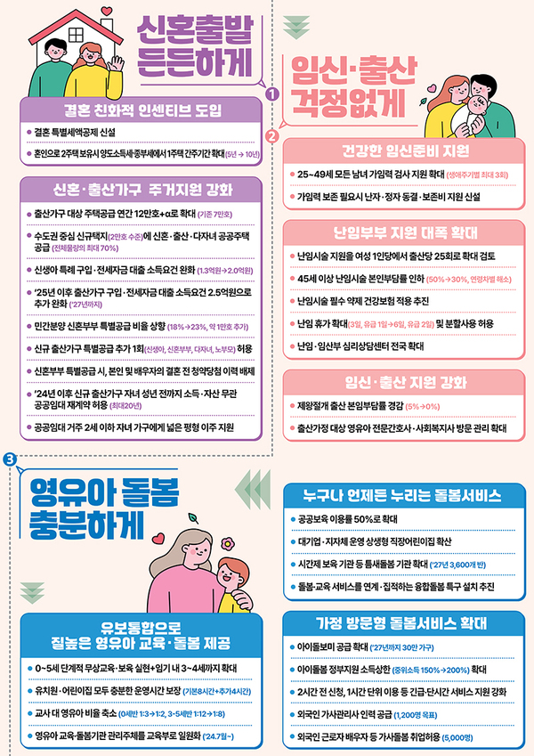 주거 및 결혼·출산·양육을 위해 ▲신생아특례대출 소득기준 한시 폐지▲출산가구 주택공급 연 12만 호로 확대 ▲신혼·출산·다자녀가구 주택 최대 1만 4000호 공급 ▲신규 출산가구 특공 추가 1회 허용 ▲결혼 특별세액공제 신설을 추진한다.
