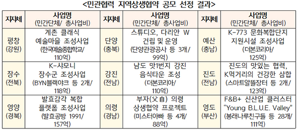 ▲ 민관협력 지역상생협약 공모 선정 결과. (표=국토교통부)먼저 문화자원과 휴양을 연계하는 사업으로, 강원 평창군은 한국예술종합학교와 함께 지역의 클래식 축제를 해마다 열고, 클래식 아카데미 운영을 위한 클래식 복합문화공간을 조성한다.