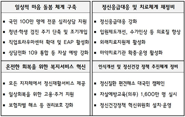 이밖에도 정신건강정책 혁신위원회를 운영하는 등 정책 거버넌스를 확립하고, 정신건강정책 및 서비스를 담당할 조직과 인력도 지속 확충한다.