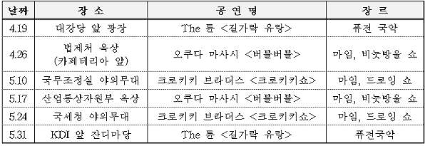 행정중심복합도시건설청은 4월부터 10월까지 매주 수요일 점심시간에 정부세종청사 및 국책연구단지 등 곳곳을 찾아가 다양한 장르의 공연 프로그램을 제공한다고 17일 밝혔다.