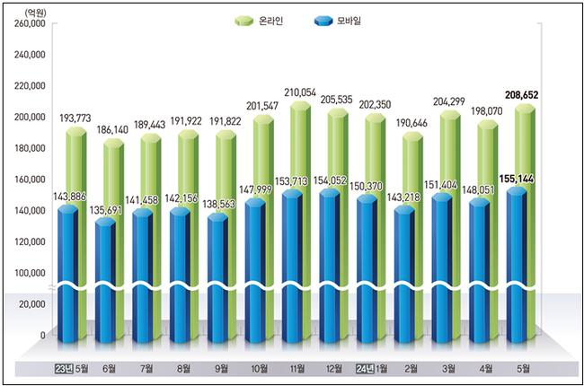 [일간환경연합 장민주 기자] 통계청이 7월 1일 발표한 `5월 온라인쇼핑 동향`에 따르면, 2024년 5월 온라인쇼핑 거래액은 전년 동월 대비 7.7% 증가한 20조 8,652억 원으로 역대 최대치를 기록했다. 이 중 모바일 쇼핑 거래액은 15조 5,144억 원으로 전년 대비 7.8% 증가하여 전체 온라인쇼핑 거래액의 74.4%를 차지했다.
