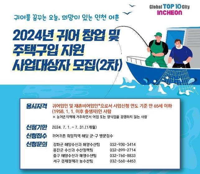 [일간환경연합 김경훈 기자] 인천광역시 수산기술지원센터는 2024년 귀어 창업 및 주택구입 지원 사업대상자를 7월 한 달간 모집한다고 밝혔다.