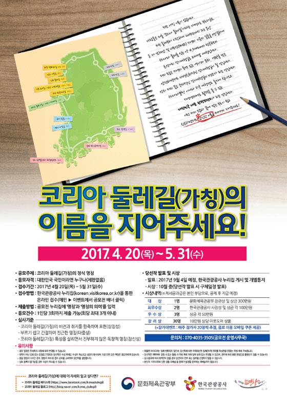[일간환경연합 장민주 기자]문화체육관광부가 한국관광공사와 함께 현재 가칭으로 사용되고 있는 ‘코리아둘레길’의 정식 명칭을 공모한다.