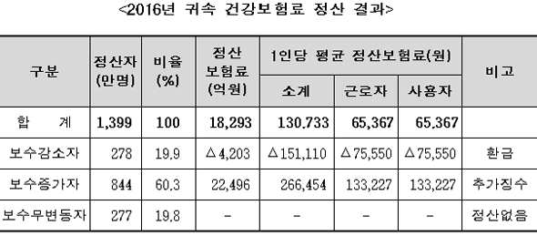 정산 대상 가운데 278만명(19.9%)은 보수가 줄어 본인과 사용자가 각각 7만 6000원을 돌려받는다. 보수에 변동이 없었던 277만명(19.8%)은 정산보험료가 없다.
