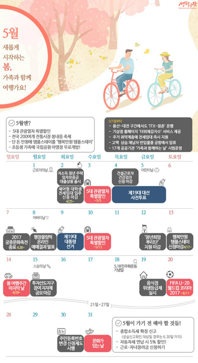 [일간환경연합 한선미 기자]5월에 누릴수 있는 정책을 소개합니다. 인포그래픽뉴스로 한눈에 확인 할수 있습니다.