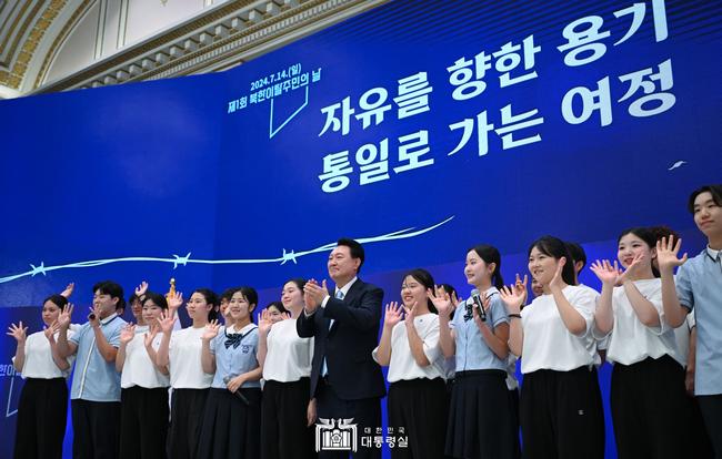 윤석열 대통령은 7월 14일 청와대 영빈관에서 개최된 `제1회 북한이탈주민의 날 기념식`에 참석했다.