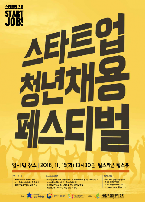 중소기업청은 청년위원회, 중기청 등 정부기관과 청년희망재단, 서울산업진흥원 등 민간기관 및 연세대학교 등 7개 대학이 연합해 5월 23일 연세대(백양누리)에서 스타트업 청년채용 페스티벌을 개최한다고 밝혔다.