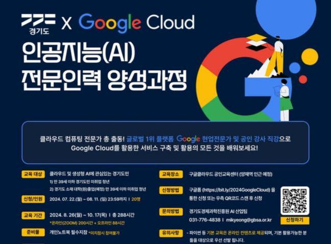 [일간환경연합 김경훈 기자] 경기도와 경기도경제과학진흥원(이하 경과원)은 클라우드 기술과 인공지능(AI)분야에 특화된 인재를 양성하기 위해 `경기도와 구글 클라우드가 함께하는 인공지능(AI) 전문인력 양성과정` 교육생을 오는 8월 11일까지 모집한다.
