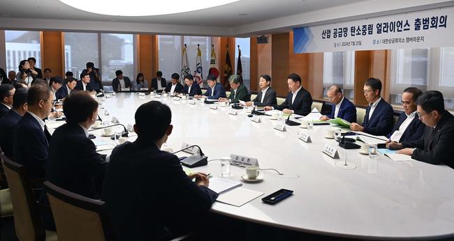 안덕근 산업통상자원부 장관은 2024. 7. 25(목) 15:30 서울 중구 대한상공회의소에서 김상협 탄소중립녹색성장위원회 위원장, 최태원 대한상공회의소 회장을 비롯한 정부, 경제단체, 업종별협회, 지원기관 관계자 등이 참석한 가운데 `산업 공급망에 대한 글로벌 탄소규제에 효과적으로 대응`하기 위해 열린 「산업 공급망 탄소중립 얼라이언스 출범회의」에 참석하여, 개회사를 한 후 글로벌 탄소규제 및 국내 대응현황 등을 논의하고, 산업 공급망 탄소중립 얼라이언스 출범식을 가졌다.