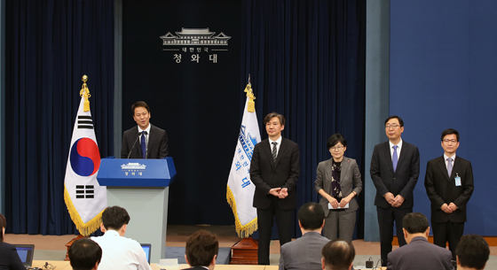 임종석 대통령 비서실장이 11일 청와대 춘추관 대브리핑실에서 주요 수석을 발표하고 있다. 왼쪽 두 번째부터 조국 민정수석, 조현옥 인사수석, 윤영찬 홍보수석, 이정도 총무비서관. (사진=청와대 제공) |