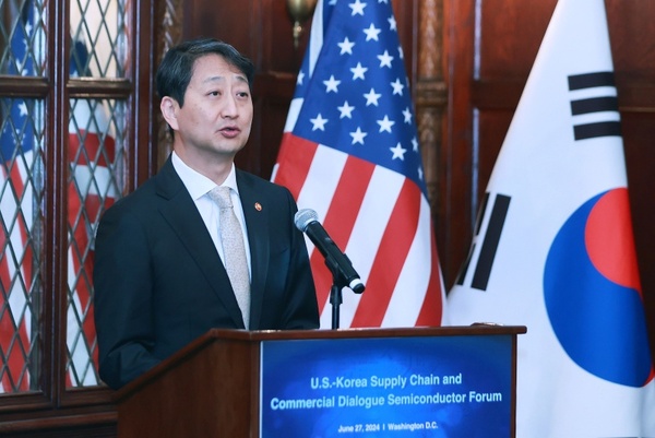 ▲ 안덕근 산업통상자원부 장관이 지난 6월 미국 워싱턴 DC에 위치한 아담스호텔에서 열린 한-미 공급망·산업 대화 반도체 포럼에서 개회사를 하고 있다.(ⓒ뉴스1,) 이번 한-미 에너지장관회담에서 양국은 탄소 배출 감축, 에너지 안보 강화를 위한 협력 강화 방안을 모색하고, 산업 및 전력 부분의 탈탄소화 등에 대한 국제사회에서의 공조 방안을 논의했다.