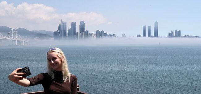 무더운 날씨를 보인 지난 6월 28일 한 외국인 관광객이 부산 해운대구 일대에 낀 짙은 해무를 배경으로 셀카를 찍고 있다.(ⓒ뉴스1, )