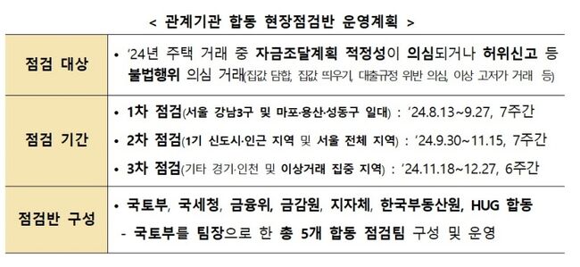 현장점검반은 국토교통부, 금융위원회, 국세청, 금융감독원, 지자체(서울시·경기도·인천시), 한국부동산원, 주택도시보증공사(이하 HUG) 합동으로 구성하며, 현장점검을 통해 집값 담합, 허위매물·신고 등 부동산 시장을 교란하는 위법행위 발생 여부를 집중 점검한다.