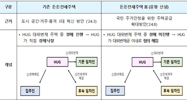 아울러, 든든전세 공급을 확대하기 위해 경매주택을 낙찰받아 임대하는 기존 든든전세 외 추가로, 경매 진행 전 HUG가 기존 집주인 주택을 대위변제금 이내로 협의매수한 후 임대하는 유형(든든전세주택 Ⅱ)을 신설한다.