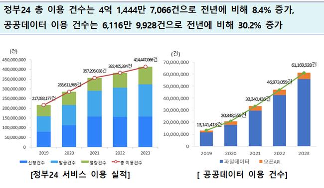 행정기관을 방문하지 않고 24시간 365일 필요한 민원을 신청·발급·열람할 수 있는 정부24 서비스 총 이용 건수는 4억 1,444만 7,066건으로 전년에 비해 8.4%(3,204만 1,732건) 증가했다.