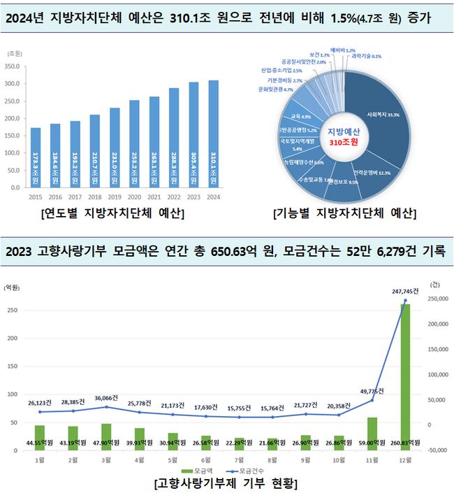 2024년 지방자치단체 예산은 310.1조 원(당초예산, 순계)으로 전년(305.4조 원)에 비해 1.5%(4.7조 원) 증가했고, 기능별 예산 비중은 사회복지 33.3%(103.2조 원), 인력운영비 12.3%(38.2조 원), 환경보호 9.5%(29.6조 원) 순으로 높았다.