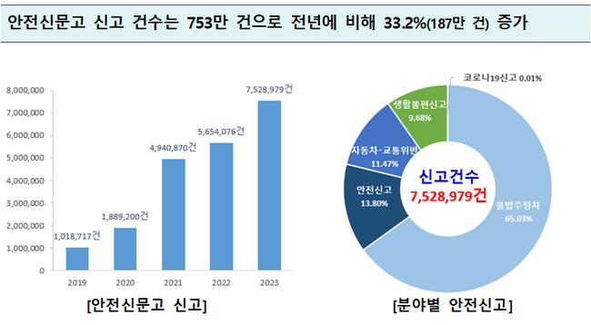 안전신문고 신고 건수는 752만 8,979건을 기록하여 전년(565만 4,076건)에 비해 33.2%(187만 4,903건) 증가했다.