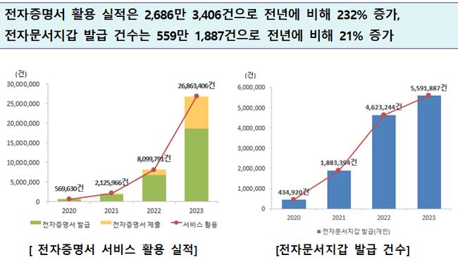 주민등록등․초본, 건강보험표 납부확인서 등 각종 증명서를 스마트폰으로 발급·제출할 수 있는 모바일 전자증명서 서비스는 2023년 서비스 활용 실적이 2,686만 3,406건으로 전년(809만 9,791건)에 비해 232%(1,876만 3,615건) 로 대폭 증가했다.