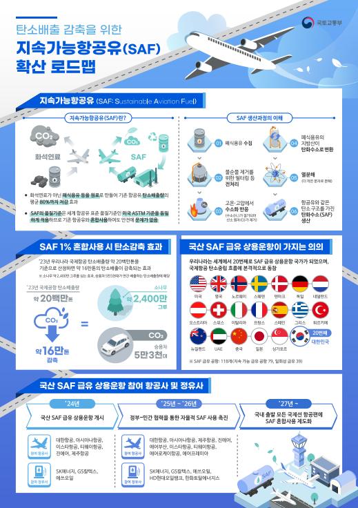 `국토부・산업부, 국적항공사・국내 정유사, 인천국제공항공사・한국공항공사`간 `SAF 상용운항을 위한 양해각서(MOU)`를 체결(8.30)하여 국내 SAF 사용확대에 상호 협력한다.