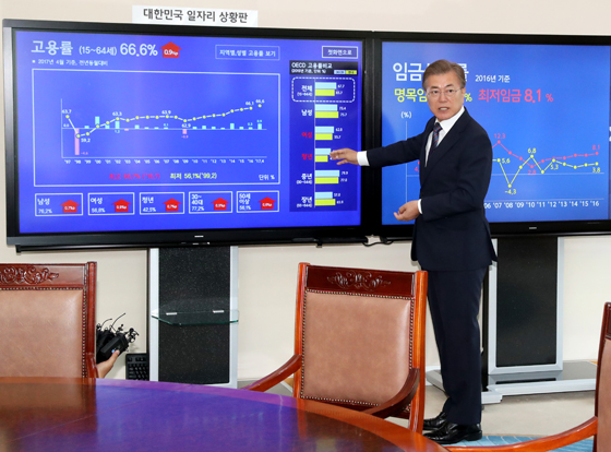 이날 문 대통령은 일자리 상황판의 여러 지표들을 직접 점검하는 시연을 하고 몇 가지 당부를 전했다.