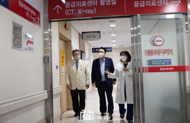 윤석열 대통령은 4일 저녁 8시 50분 쯤 의정부 성모병원 권역응급의료센터를 방문해 1시간 20분 가량 머물며 국민 건강을 위해 헌신하고 있는 의료진을 격려하고 현장의 의견을 청취했다.