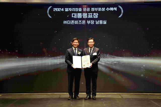 5일 서울 영등포구 CCMM빌딩에서 열린 고용노동부의 `2024 일자리창출 유공정부 포상 시상식`에서 더존비즈온 인사기획 유닛장 남동실 부장(오른쪽)이 김문수 고용노동부 장관과 기념촬영을 하고 있다