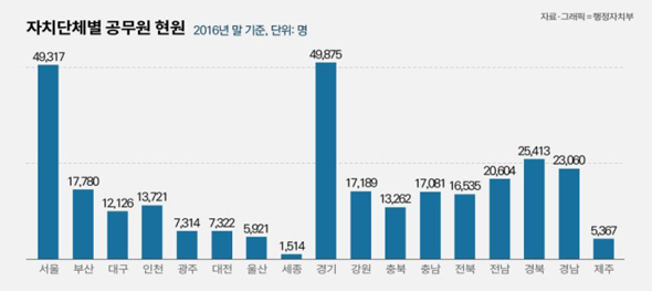 반면, 서울시는 5만 3956명에서 4만 9317명으로 공무원 수가 줄었다. 경남(2만 5114명→2만 3060명), 전남(2만 1681명→2만 604명), 전북(1만 6916명→1만 6535명) 등도 공무원 수가 감소했다.