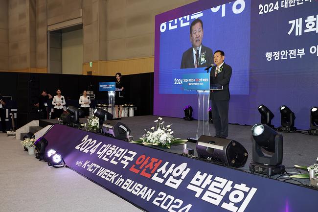 이상민 행정안전부 장관이 10일 오전 부산 벡스코에서 열린 2024년 안전산업박람회에 참석하여 개회사를 하고 있다.