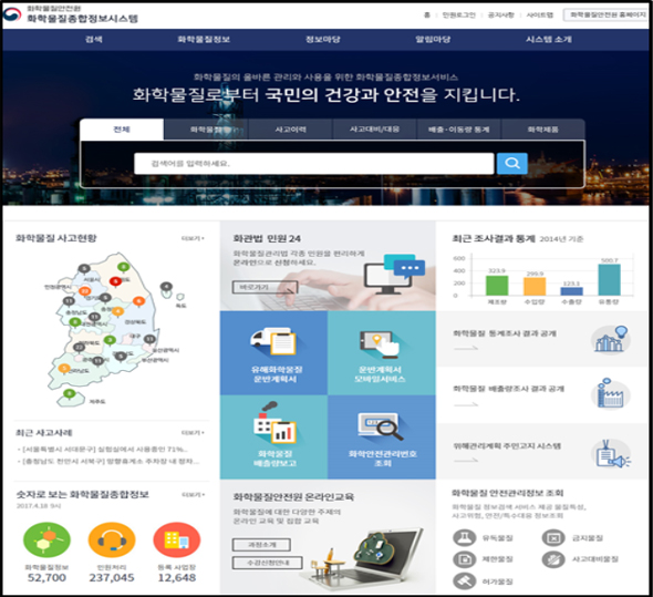 이상목 안전원 정보화기획TF팀장은 “이번 포털의 본격적인 운영을 계기로 그간 개별 시스템 또는 별도의 누리집에서 운영되던 화학물질 관련 각종 정보를 한 군데에서 확인할 수 있을 것”이라고 밝혔다.