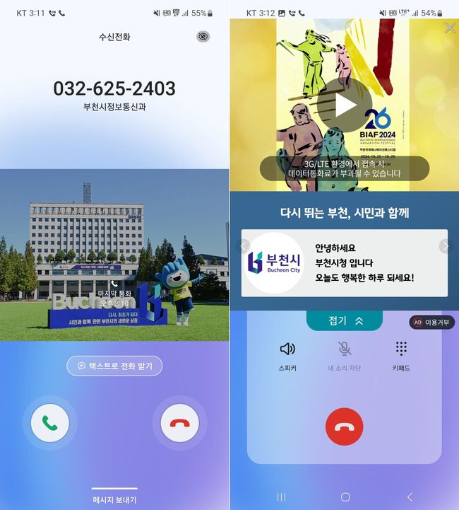 부천시 행정전화 스마트 레터링 서비스 전화 수신 화면