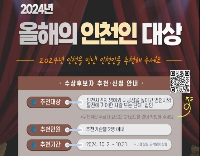 [일간환경연합 김경훈 기자] 인천광역시는 2024년 `올해의 인천인 대상` 후보자를 10월 2일부터 10월 31일까지 추천 또는 신청을 통해 접수한다고 밝혔다.