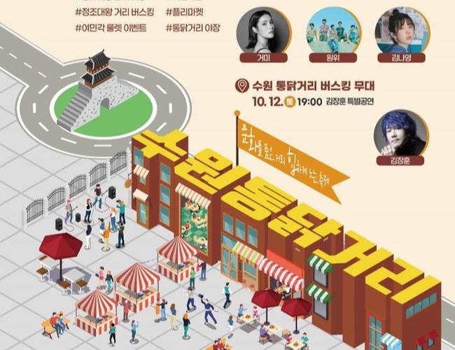 수원시가 주최하고, 행궁문화거리상인회가 주관하는 이번 수원 통닭거리 축제는 11일 오후 7시 화성행궁 광장에서 열리는 개막식으로 시작된다. 수원시립공연단의 식전 공연, 가마솥 닭강정 비빔 퍼포먼스, 가수 거미, 김나영, 밴드 원위의 축하공연이 이어진다. 12일에는 통닭거리에서 가수 김장훈이 특별공연을 한다.