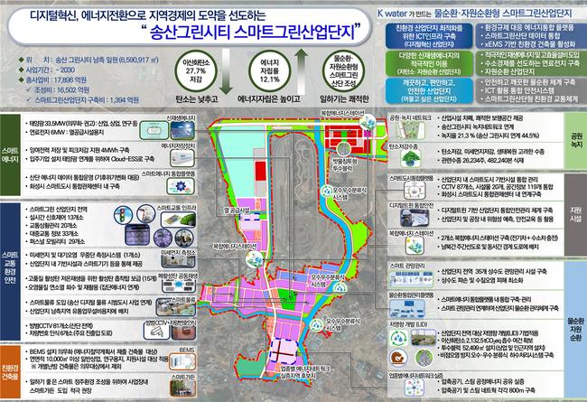 이 가운데 산업시설용지 위주로 구성된 남측지구(6.6백만㎡)를 스마트그린산업단지로 지정하기 위한 주요 계획은 다음과 같다.