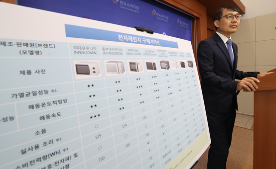 15일 정부세종청사 공정거래위원회에서 양종철 소비자원 전기전자팀장이 전자레인지 가격·품질 비교 결과를 발표하고 있다. (사진=연합뉴스 제공) |
