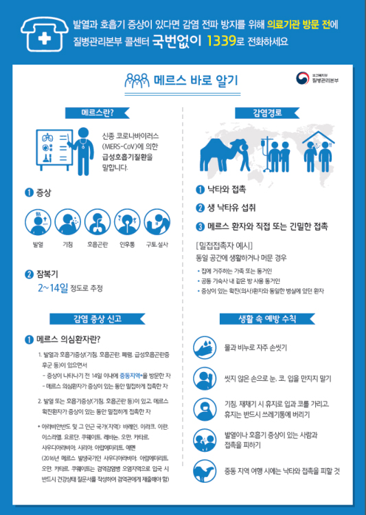 또 중동지역 여행 후 14일 이내에 발열과 기침 등 호흡기 증상이 나타나면 의료기관을 바로 방문하지 말고 질병관리본부 콜센터(1339)나 관할 보건소로 신고해야 한다고 강조했다.