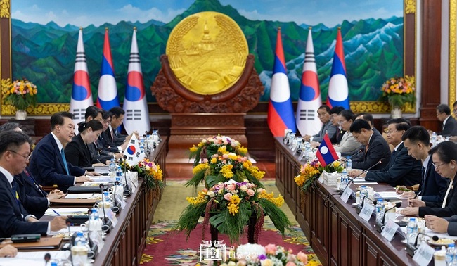 ▲ 아세안 관련 정상회의 참석을 위해 라오스 비엔티안을 방문 중인 윤석열 대통령은 10일(현지시간) 통룬 시술릿 라오스 국가주석과 첫 정상회담(확대 회담)을 가졌다.(사진=대통령실 홈페이지) 대통령은 의장국 라오스의 성공적인 아세안 정상회의 개최를 축하하고, 1995년 재수교 이래 투자, 인프라, 환경, 노동, 인적교류를 비롯한 다양한 분야에서 양국 관계가 강화되고 있어 기쁘게 생각한다고 했다.