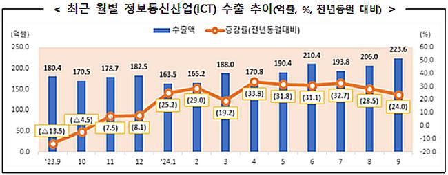 2024년 9월 정보통신산업(ICT) 수출이 역대 두 번째 규모인 223억 6천만 달러를 기록하며 전년 동기 대비 24% 증가했다.