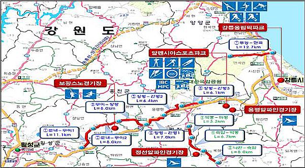 국토교통부는 지자체와 함께 올림픽 경기장 등 주요 시설의 접근성을 향상시키기 위해 총사업비 7조 7672억 원을 투입해 고속도로, 국도, 지방도 등 328km를 계획했고 한창 건설 중이라고 20일 밝혔다.