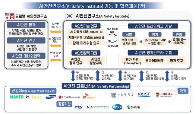 ▲ ‘AI안전연구소’ 기능 및 협력체계(이미지=과학기술정보통신부 제공)지난 5월에 개최한 AI서울정상회의에서도 국가 차원의 AI안전 연구와 글로벌 협력의 중요성을 강조하며 ‘AI안전연구소’ 설립을 핵심의제로 논의했다.