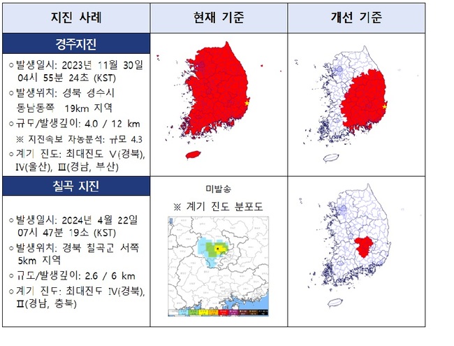 이에 기상청은 관계 부처와의 논의를 거쳐 지진재난문자 송출 기준을 규모 중심에서 진도 기반으로 개선하고 재난문자 송출 범위를 광역시·도에서 시군구로 세분화하는 등 개선 방안을 마련해 시행한다.