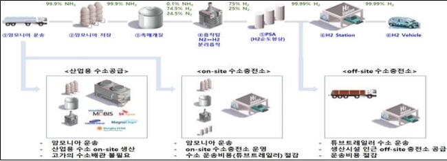 이러한 이점으로 내륙에 구축된 거점형 수소 생산기지에서 수소 생산원료로 사용하기 적합하고, 이렇게 실증시설을 통해 생산한 수소는 기존 연료전지, 수소차 충전 등 다양한 산업분야에 활용할 수 있다.